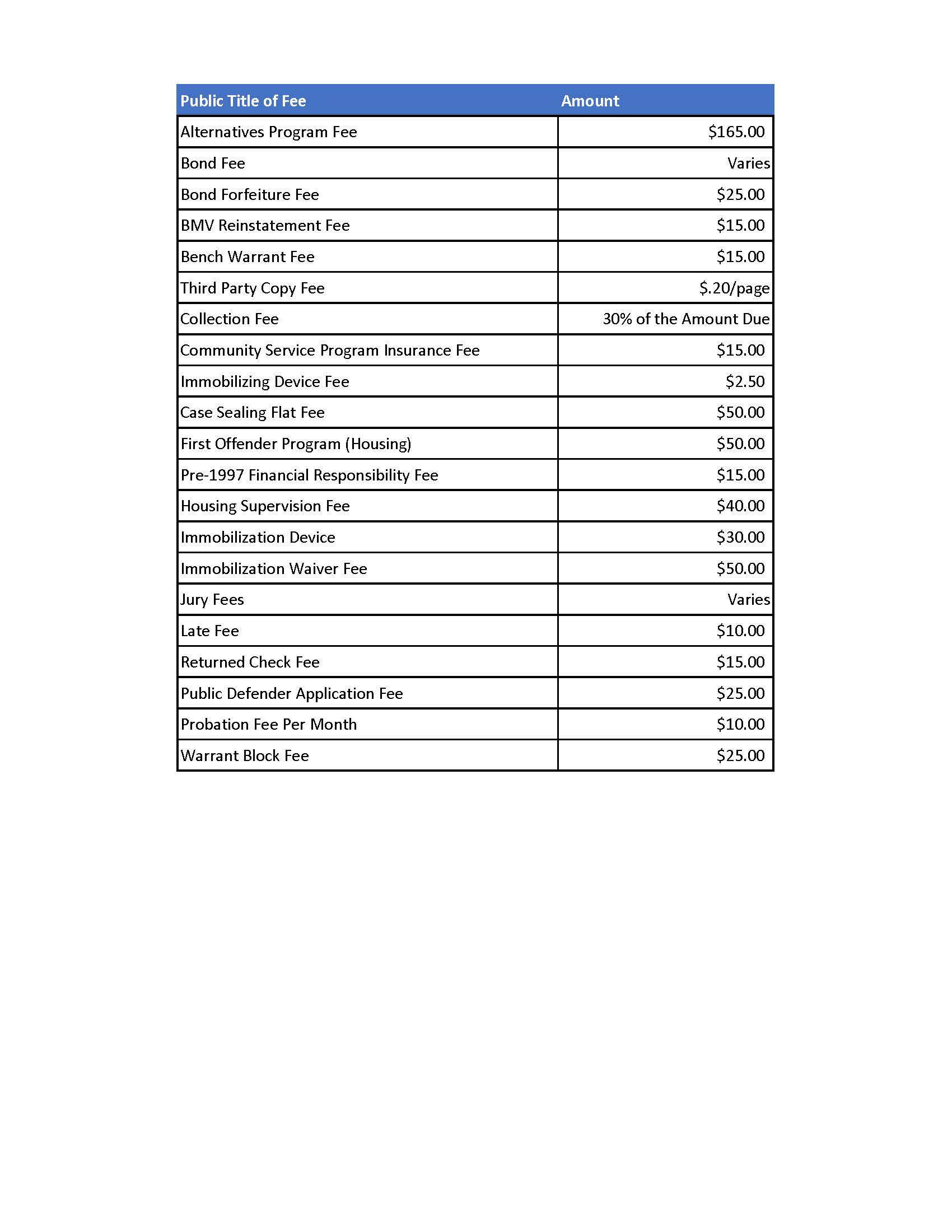 Additional costs, such as public defender applications fees and jury costs, may also be assessed. A $15.00 fee shall be assessed for each bench warrant issued. The clerk shall add any other costs required by law. See below for a comprehensive list of costs.